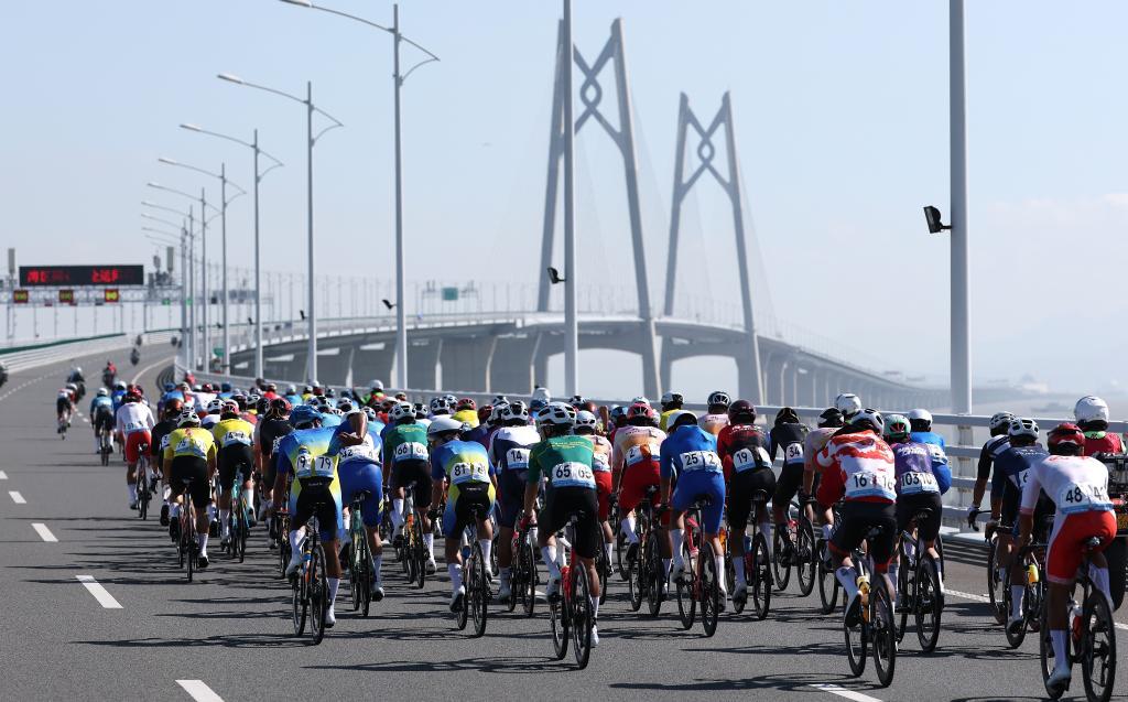 11月8日,参赛选手在港珠澳大桥骑行。当日进行的第十五届全国运动会公路自行车男子个人赛,赛道全程231.8公里,选手经过港珠澳大桥,跨越粤港澳三地。这是全运会历史上首次举办跨境比赛。新华社记者 毛思倩 摄