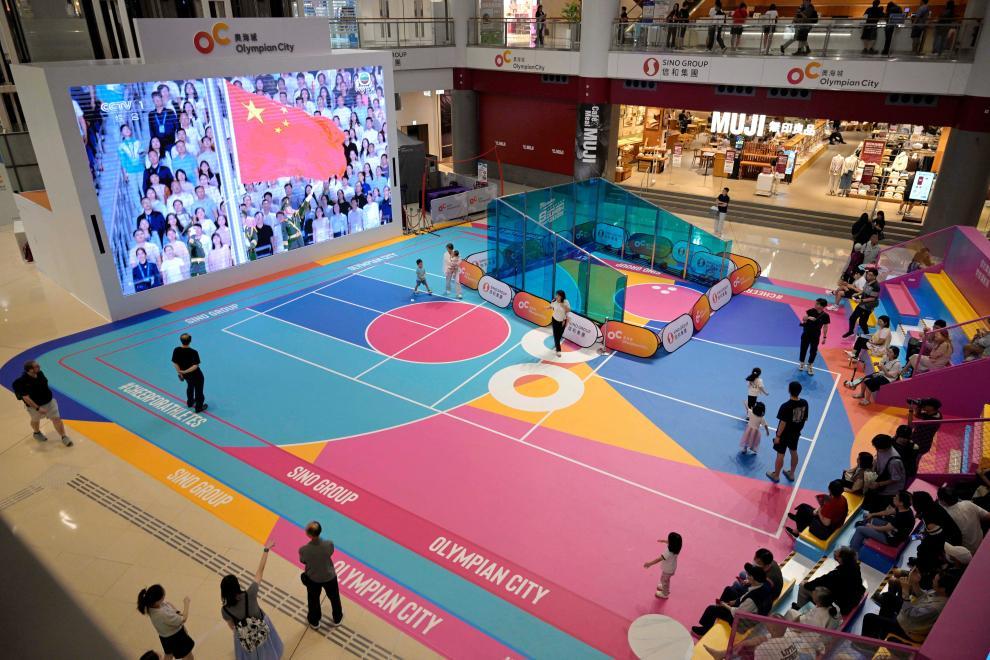 11月9日,第十五届全国运动会开幕式在广东奥林匹克体育中心举行,这是香港市民在一家商场内观看直播。新华社发(卢炳辉 摄)