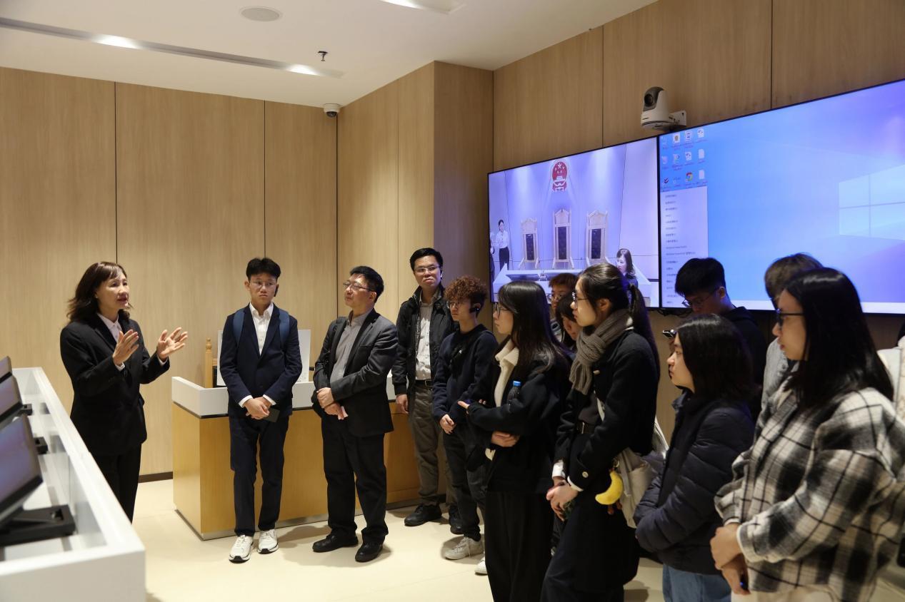 在诉讼服务中心,同学们现场体验了网上立案、在线委托授权等全流程诉讼服务,感受内地法院“指尖诉讼、掌上办案”的便捷高效。在ADR国际商事争议解决中心,工作人员介绍了粤港澳大湾区跨境纠纷多元化解模式,尤其是融合东方“以和为贵”理念的商事调解机制,引发同学们浓厚兴趣。“法律不仅是条文,更是有温度的社会治理智慧。”一位同学在交流中说道。