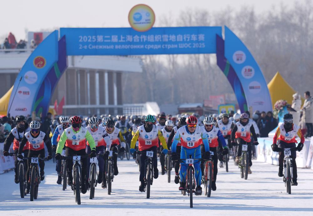 2025年1月11日,选手在哈尔滨太阳岛风景区参加2025第二届上海合作组织雪地自行车赛。