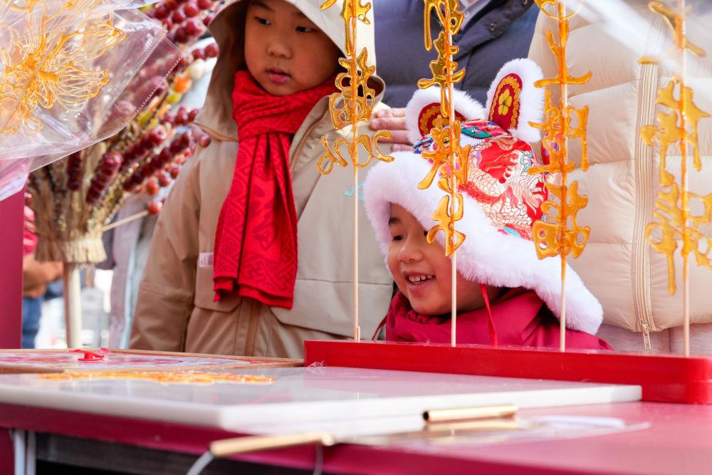2026年2月7日,小朋友在江苏南京举行的“乐购新春 苏品苏货”年货大集上观看糖画制作。