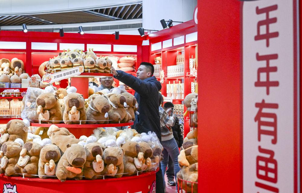 2026年2月7日,市民游客在上海市南京路步行街一家春节限定潮玩快闪店挑选商品。