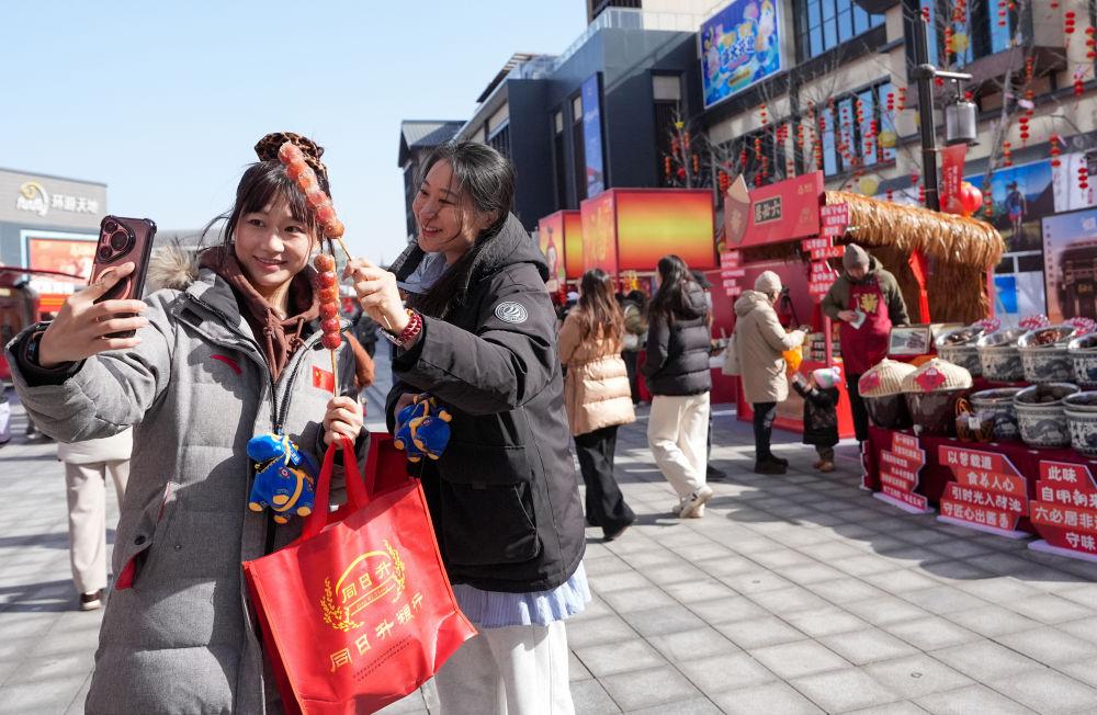两位游客在拿着刚购买的糖葫芦自拍。