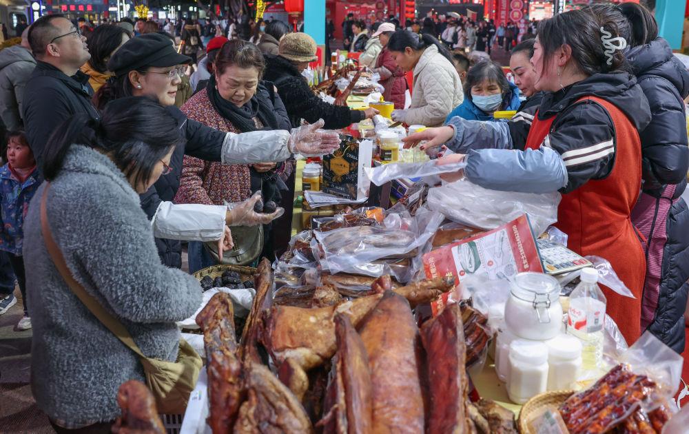 2026年2月1日,在重庆市两江新区观音桥步行街,市民在现场选购巴渝“土特产”。当日,巴渝“土特产”名优百品年货季在重庆启幕。本次年货季吸引近百家经营主体参展,集中展示重庆各地优质土特产。