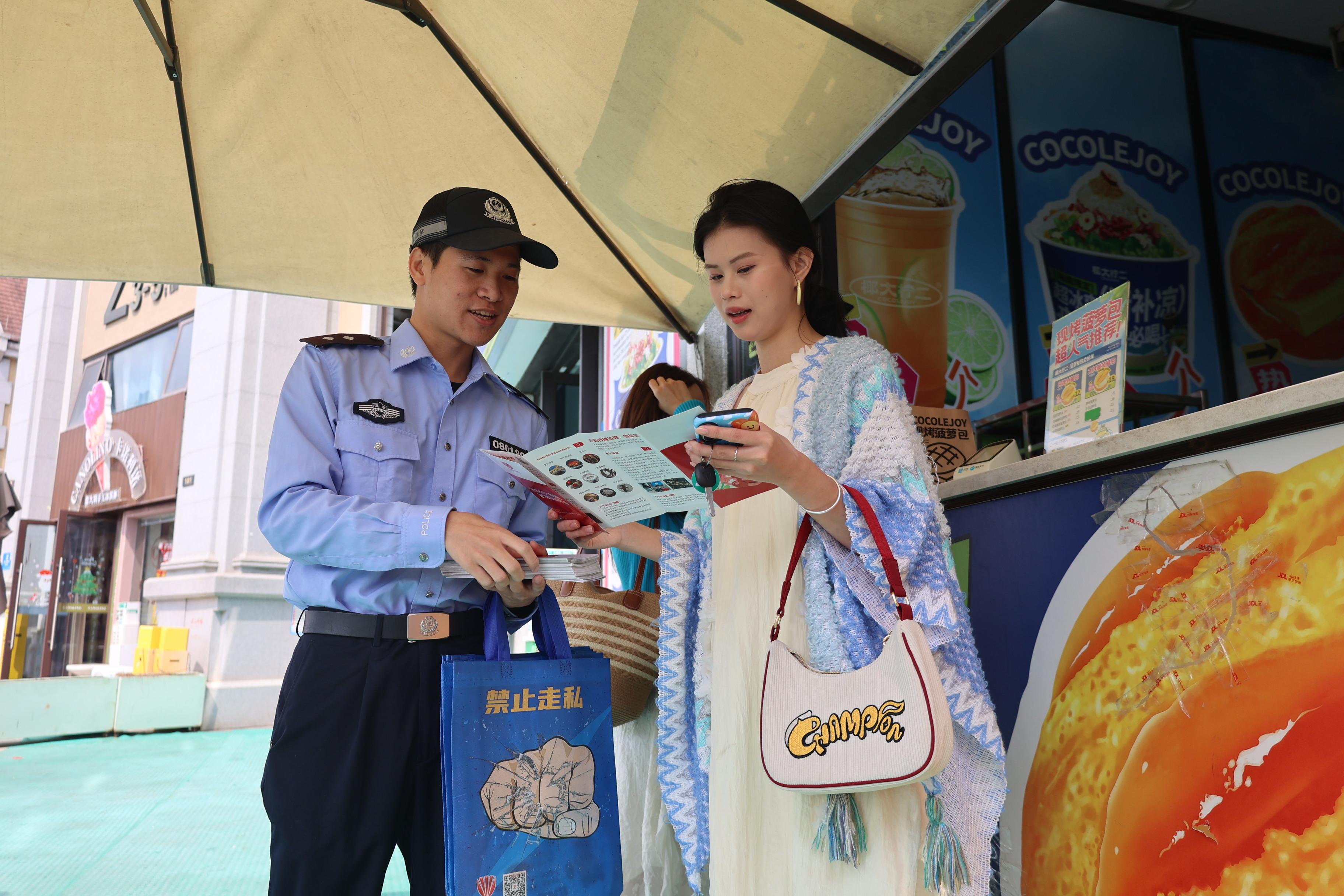 期间,民辅警来到辖区人员较多的神州半岛等景区景点和餐饮酒店服务场所,向场所管理人员、收银员等工作人员,发放印有反走私宣传标语、举报方式的购物袋和宣传折页,宣传《海南自由贸易港反走私条例(试行)》《海南省反走私举报奖励办法(试行)》、岛内居民消费进境商品“零关税”政策等内容,发动场所从业人员积极举报走私违法犯罪线索。
