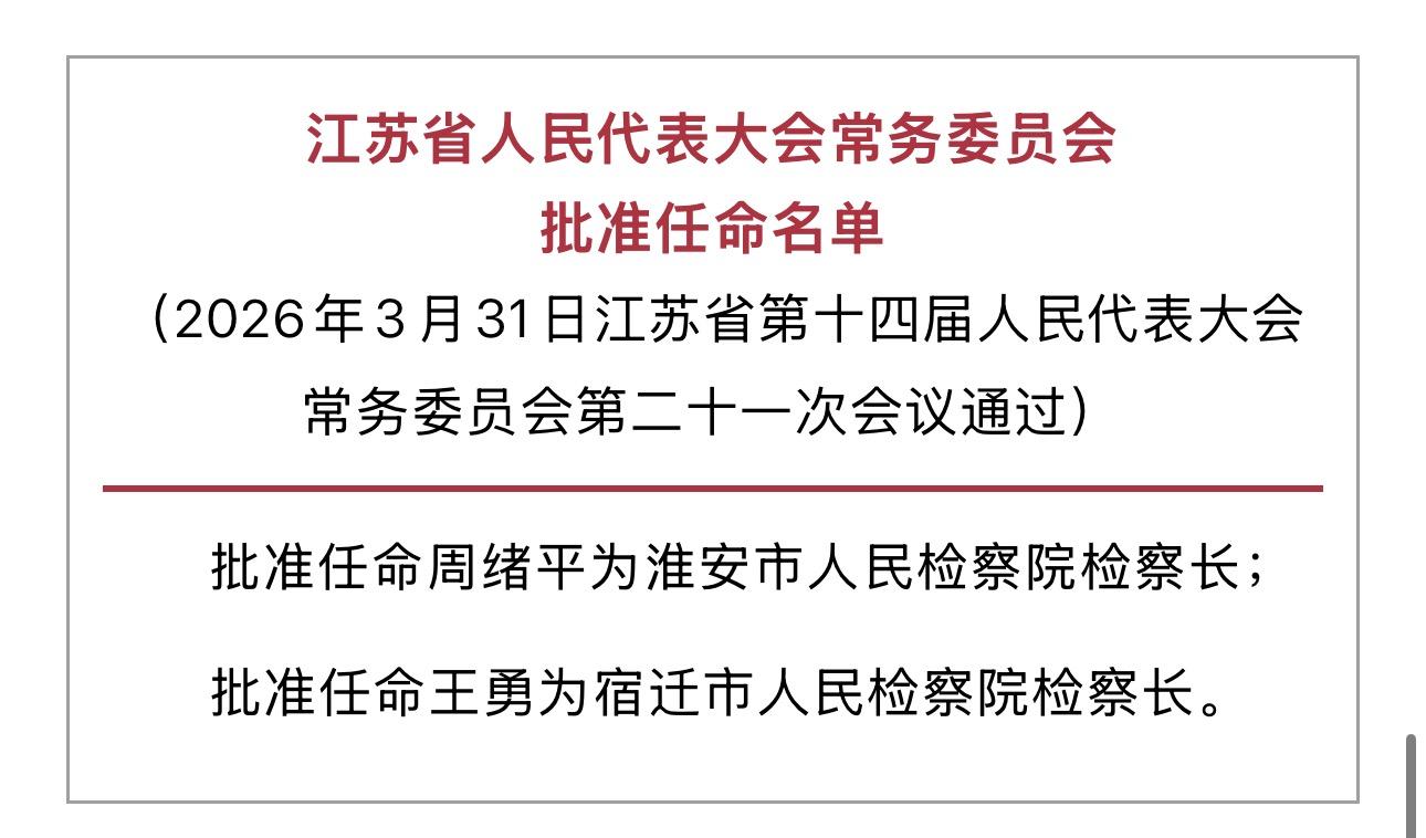3月31日,江苏省第十四届人民代表大会常务委员会第二十一次会议批准任命周绪平为淮安市人民检察院检察长,批准任命王勇为宿迁市人民检察院检察长。