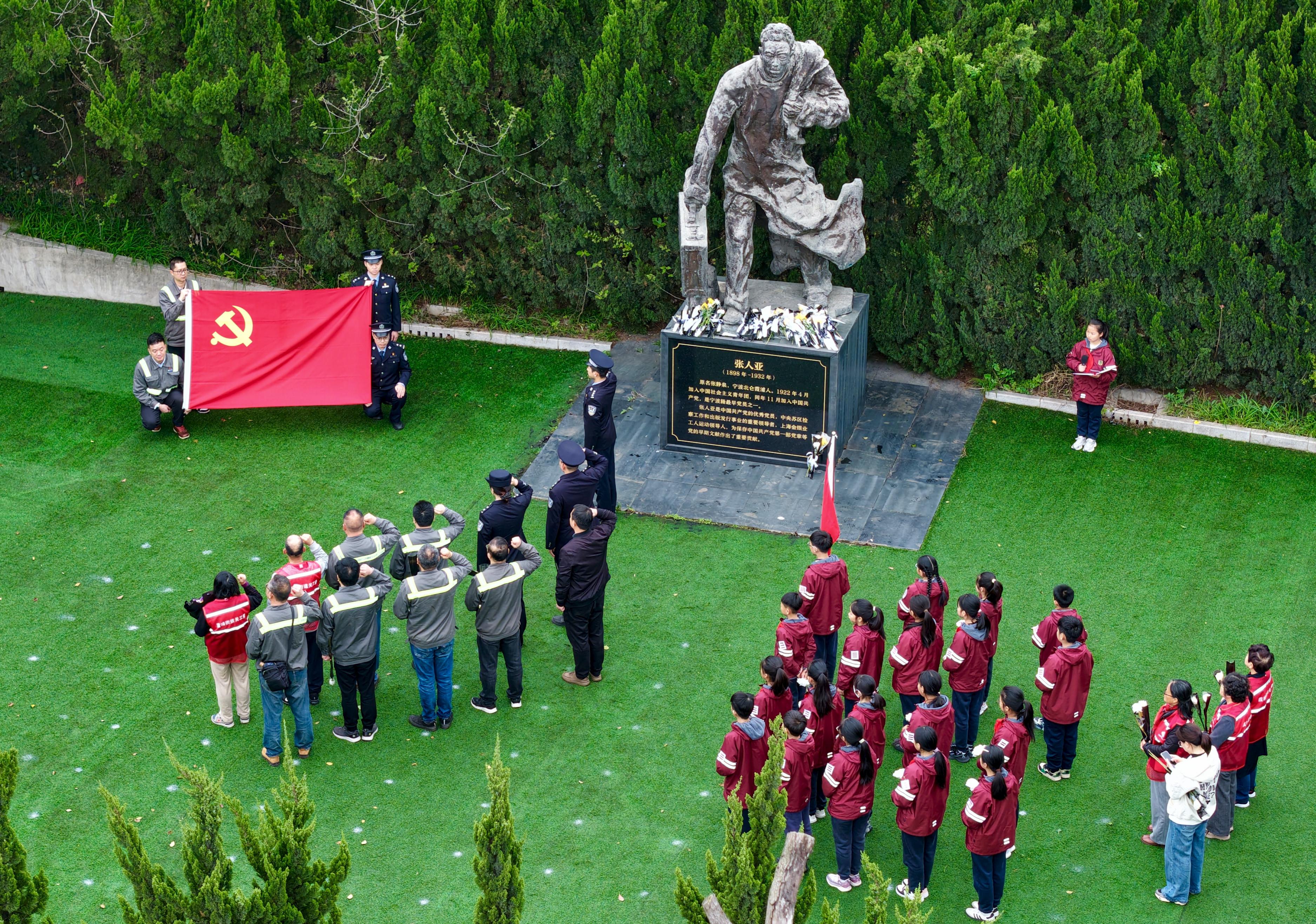 在庄严肃穆的氛围中,全体人员整齐列队,面向张人亚雕像默哀一分钟,表达深切哀思。默哀仪式后,全体少先队员面向雕像发出激昂呼号,以铿锵之声许下传承红色血脉的青春誓言。随后在边检民警的领誓下,全体党员面对鲜红的党旗,高举右拳重温入党誓词,在铮铮誓言中回望初心使命。