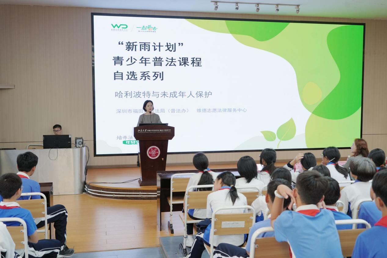近日,北大附中深圳学校(集团)外国语中学报告厅内,一场别开生面的“法治奇妙之旅”生动开讲。为深入贯彻实施《中华人民共和国法治宣传教育法》,广东省深圳市福田区司法局(普法办)充分发挥法治副校长机制作用,选派分管负责同志出任该校法治副校长,并联合福田区青少年普法“新雨计划”资深普法志愿者、律师杨丹,为150余名初中学子带来沉浸式法治教育盛宴。