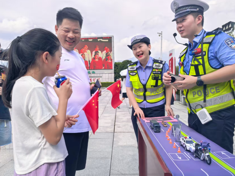 2025年国庆假期,来自湖南的游客王先生一家被“高速公路安全桌盘讲解区”吸引,民警用沙盘模拟高速爆胎、发生事故等场景,手把手教他如何正确放置三角警示牌。“原本因堵车心情很烦躁,没想到还能学到安全技能,井冈山的高速交警太有心了。”王先生连连称赞。