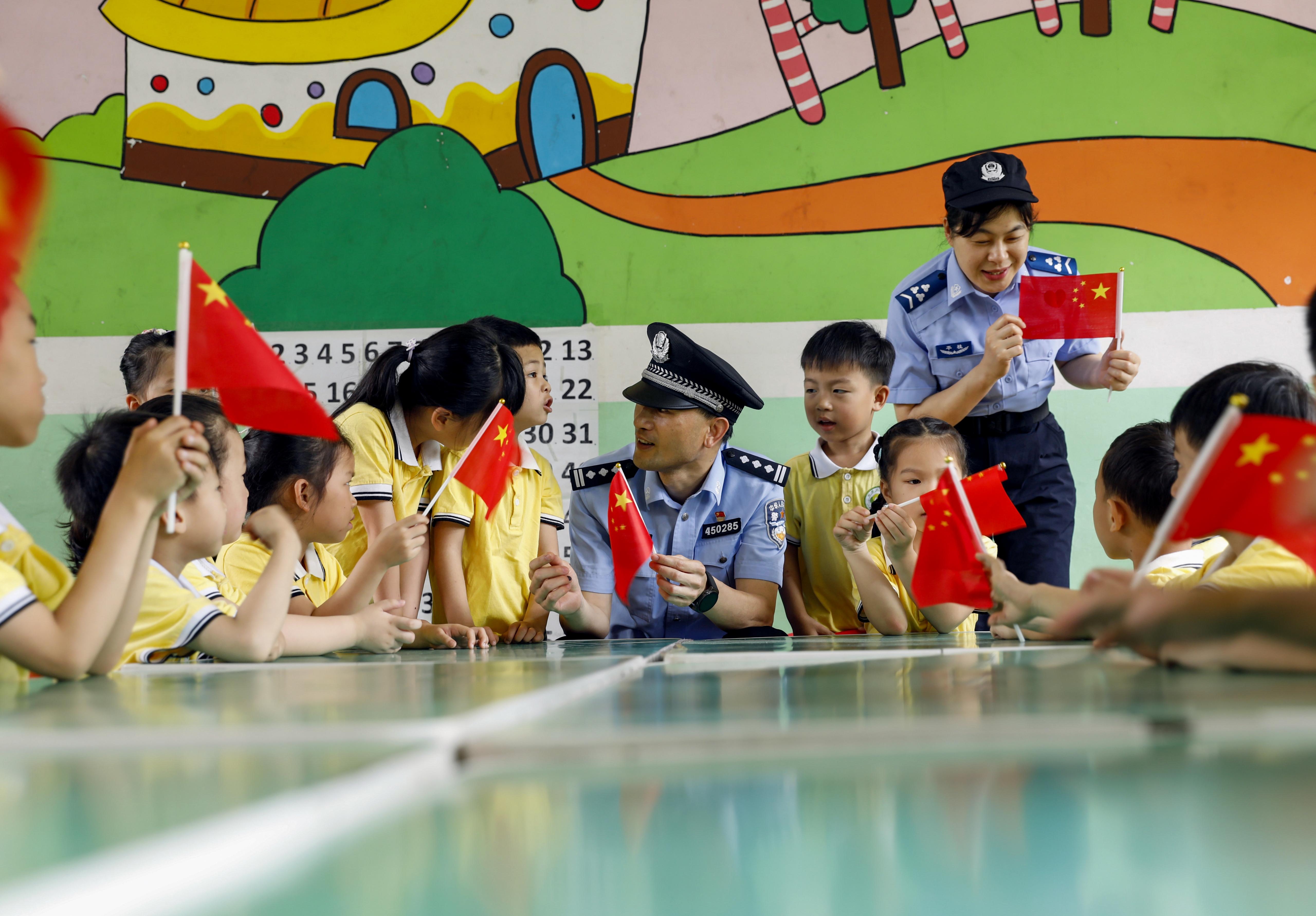 4月13日,广西壮族自治区贺州市公安局平桂分局民辅警走进辖区幼儿园开展国家安全宣传教育活动,通过游戏互动等趣味形式,将爱国与安全的种子播撒进孩子们的心田。