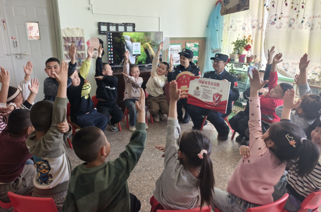 在第十一个全民国家安全教育日来临之际,4月13日,新疆阿勒泰边境管理支队冲乎尔边境派出所民警走进辖区孔吐汗村幼儿园,开展“国家安全 共‘童’守护”普法宣传活动。民警化身“安全老师”,通过展示卡通图片、播放动画短片、情景互动等形式,引导孩子们树立国家安全意识。