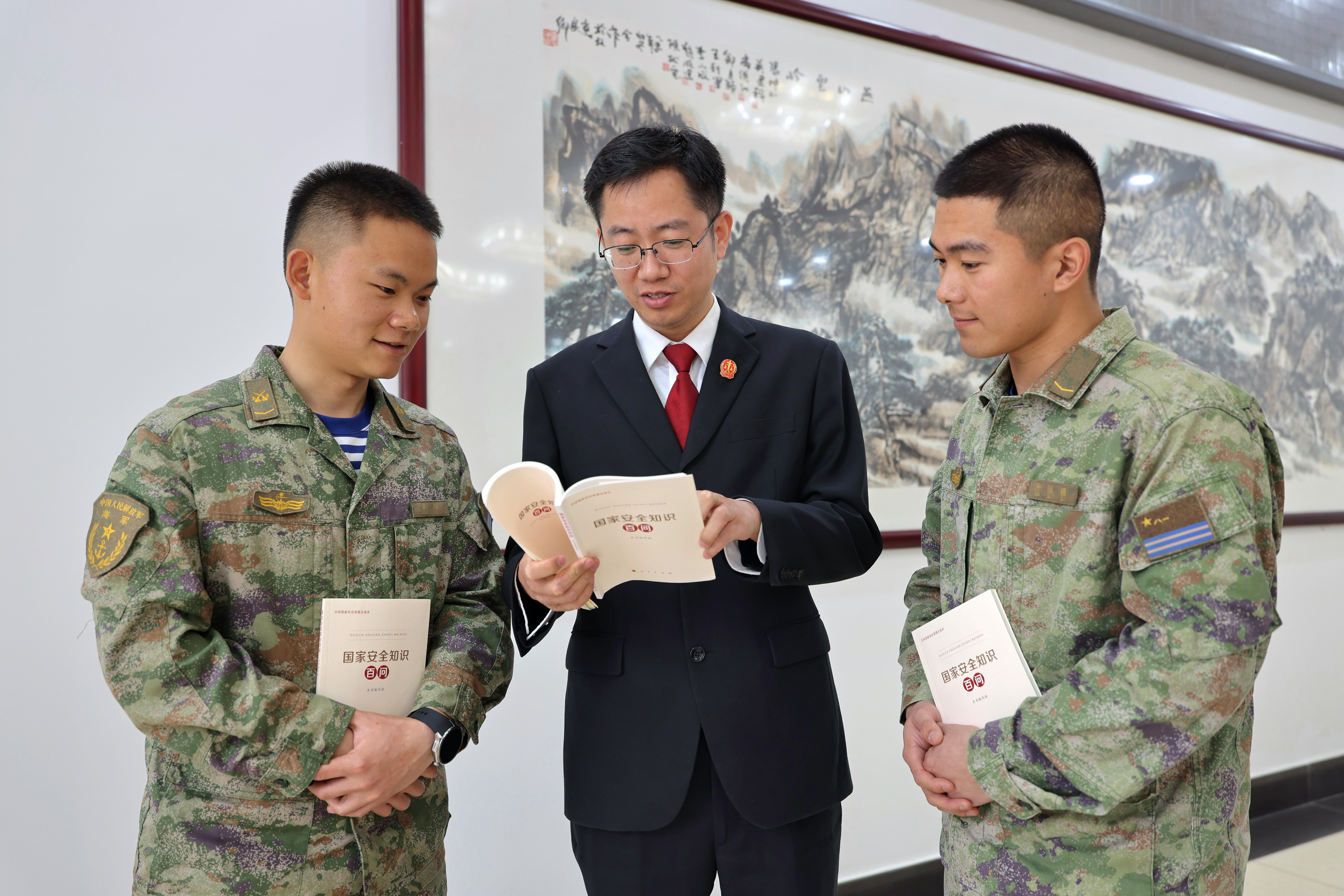 图为普法讲座后,法官与部队官兵共同学习《国家安全百问知识》。