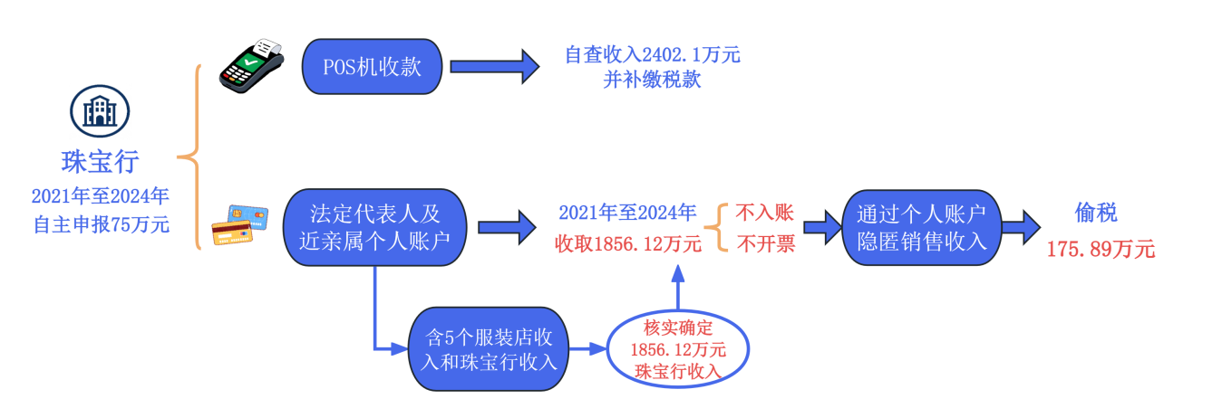 很快,富晨珠宝行自查调增2021-2024年营业收入至2402.1万元,并补缴了税费款,而且其提供的佐证资料中,店内POS机收款金额与自查后的2402.1万元收入相对应,表面上虽已账实相符,但对比同地段、同规模的其他珠宝行,其自查后年均申报收入仍然偏低。对此,阿克苏地区税务局稽查局决定对其立案检查。
