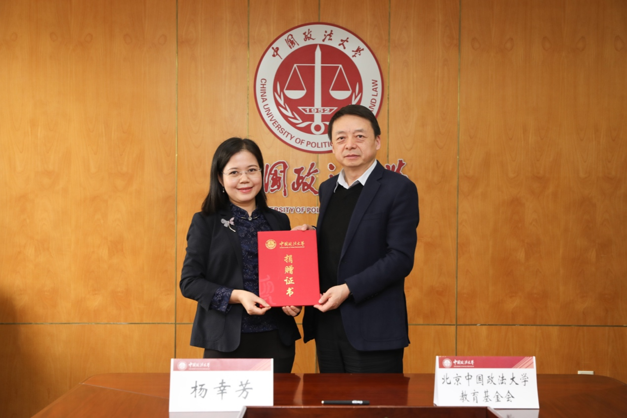3月13日,中国政法大学举行了一场校友捐赠仪式,校友杨幸芳向中国政法大学进行了资金捐赠。中国政法大学校长马怀德、副校长卢春龙、校友杨幸芳出席捐赠仪式。捐赠资金将用于设立“武经卓异法学人才奖学金”和“武经卓异研究生教育督导奖”奖教金。