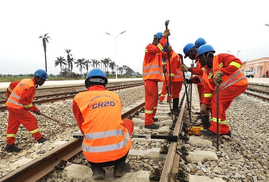 8月2日,在安哥拉洛比托铁路项目现场,中国中铁二十局本格拉铁路项目员工在进行铁路维护。新华社发(柳志摄)