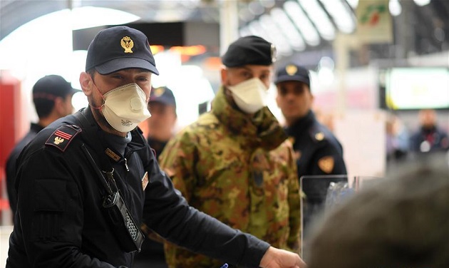 3月9日,在意大利米兰中央火车站,一名戴口罩的警察询问旅客出行信息。 意大利总理孔特9日晚发表电视讲话说,为避免新冠肺炎疫情进一步扩散,自10日起在全国范围内实施封城。除可证明的工作、健康和紧急需求三种特殊原因,全国范围内的民众不得擅自离开所在地。 新华社发(达尼埃莱·马斯科洛摄)