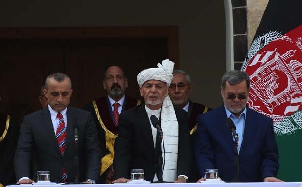3月9日,在阿富汗首都喀布尔,当选总统阿什拉夫·加尼(中)在总统就职仪式上宣誓。 赢得连任的阿富汗总统阿什拉夫·加尼9日在首都喀布尔宣誓就职,开始第二个总统任期,任期5年。 新华社发(拉赫马图拉·阿里扎达摄)