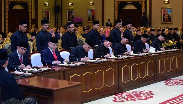 这张马来西亚新闻局提供的照片显示,3月10日,在马来西亚普特拉贾亚,新内阁部长参加宣誓就职仪式。 当日,马来西亚新内阁在最高元首阿卜杜拉面前宣誓就职。 新华社发(马来西亚新闻局供图)