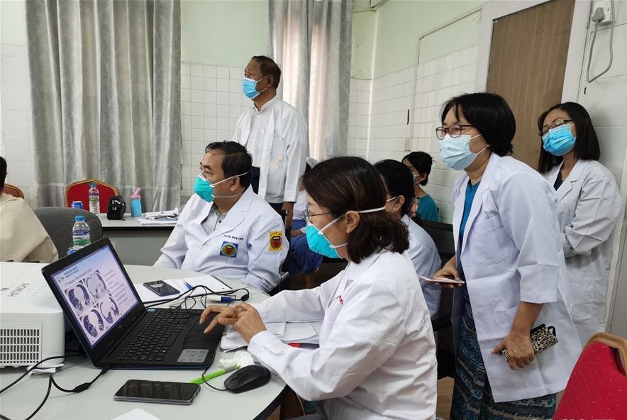4月14日,在缅甸曼德勒省曼德勒人民医院,中国援缅抗疫医疗专家组成员与当地医务人员分享新冠疫情防控经验。 近日,中国援缅抗疫医疗专家组离开仰光前往曼德勒对缅方新冠疫情防控工作进行实地调研并与缅方分享防疫抗疫经验。 新华社发(中国驻缅甸大使馆供图)