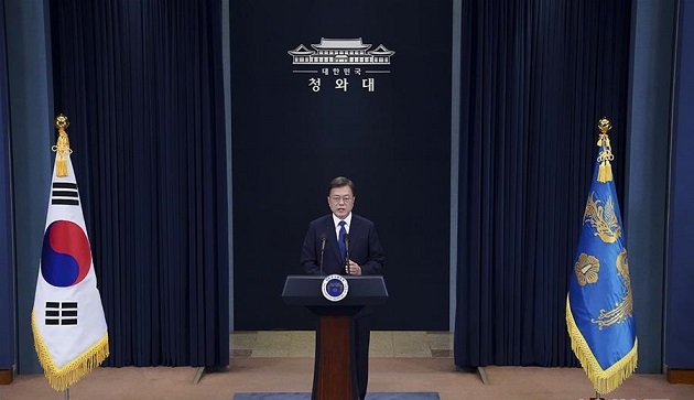 5月10日,在韩国首尔青瓦台,韩国总统文在寅发表就职三周年特别讲话。 韩国总统文在寅10日发表就职三周年特别讲话时表示,韩国政府将进一步完善防疫体系,增强传染病应对力量。 新华社发(青瓦台供图)