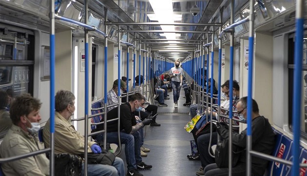 5月12日,在俄罗斯首都莫斯科,人们佩戴口罩乘坐地铁。 据俄罗斯防疫指挥部12日消息,过去24小时俄新增新冠确诊病例10899例,累计确诊232243例。 新华社发(亚历山大 摄)