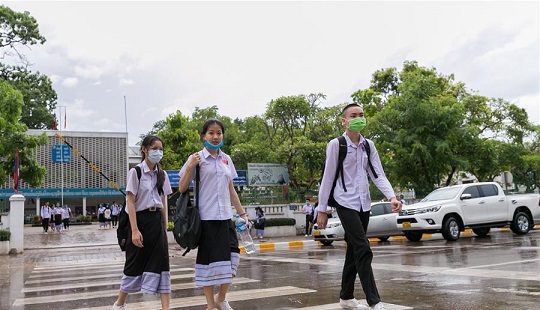 5月19日,在老挝首都万象,学生们放学走出校园。 由于新冠疫情未见进一步扩散,老挝政府开始部分放松防控措施。18日,老挝多数小学和中学毕业年级学生返校复课。非毕业年级及大学、高等教育机构将从6月2日起复课。 新华社发(凯乔摄)