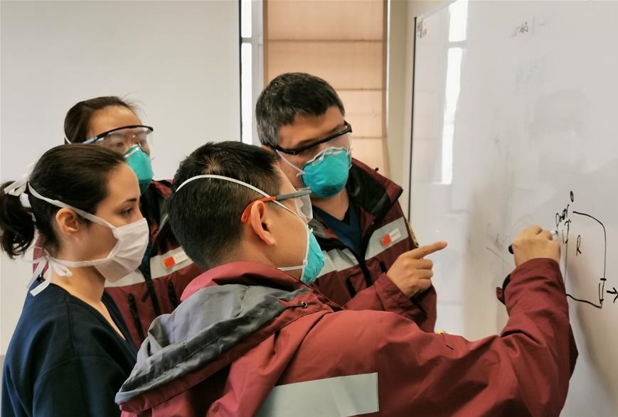 5月29日,在秘鲁首都利马比利亚·埃尔萨尔瓦多医院,中国抗疫医疗专家组成员与医院人员讨论新冠肺炎治疗流程方案。