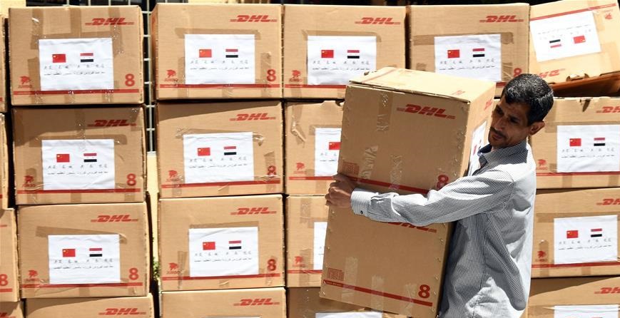 6月4日,在叙利亚首都大马士革,叙利亚卫生部工作人员搬运中国驻叙利亚大使馆捐赠的防疫物资。 中国驻叙利亚大使馆4日向叙利亚捐赠一批防疫物资,包括医用防护服、口罩、护目镜、消毒用品等。 新华社发(阿马尔·萨法尔贾拉尼摄)