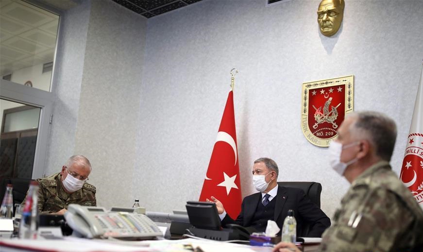 6月17日,在土耳其安卡拉,土耳其国防部长阿卡尔(中)在陆军指挥控制中心出席会议。 土耳其国防部17日在社交媒体推特上发表声明说,土耳其突击部队已对伊拉克北部库尔德工人党武装发动代号为“虎爪行动”的军事行动。 新华社发