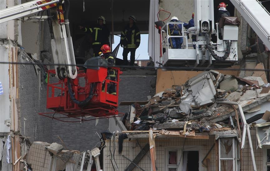 6月21日,在乌克兰首都基辅,救援人员清理居民楼爆炸现场。 乌克兰国家紧急情况局21日说,基辅市一栋10层居民楼当天上午发生爆炸,部分楼层严重损毁,已造成2人死亡。 新华社发(谢尔盖·斯塔拉斯坚科 摄)