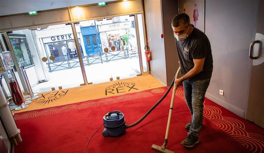 6月22日,清洁工在法国巴黎一家恢复营业的电影院内戴口罩工作。 6月22日,法国电影院恢复营业,根据有关防疫要求,不相识观众间应空出一个座位,观众要在影院大厅和走廊里戴口罩,在放映厅可摘下口罩。此外,影院须向观众提供免洗洗手液,并在电影放映前播放防疫信息。 新华社发(奥雷利安·莫里萨尔 摄)