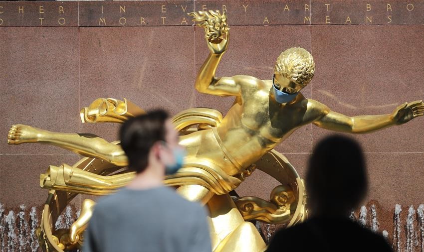 6月22日,在美国纽约洛克菲勒中心,一座雕像被“戴”上口罩。 美国约翰斯·霍普金斯大学22日发布的新冠疫情最新统计数据显示,美国累计死亡病例超过12万例。 新华社记者王迎摄