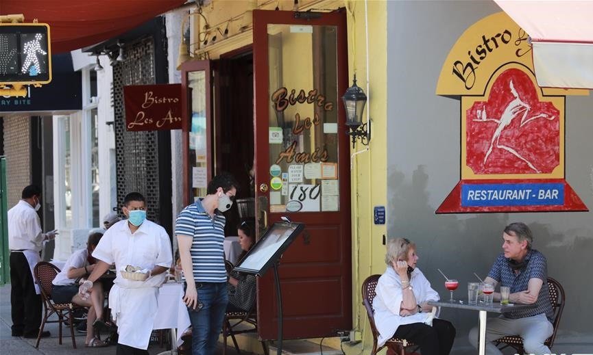 6月22日,人们在美国纽约一家餐厅的户外餐区就餐。 纽约市22日进入经济重启的第二阶段。根据重启计划,第二阶段时理发店重开,车辆和房地产销售等企业可复工,餐厅可提供户外就餐服务。 新华社记者 王迎 摄