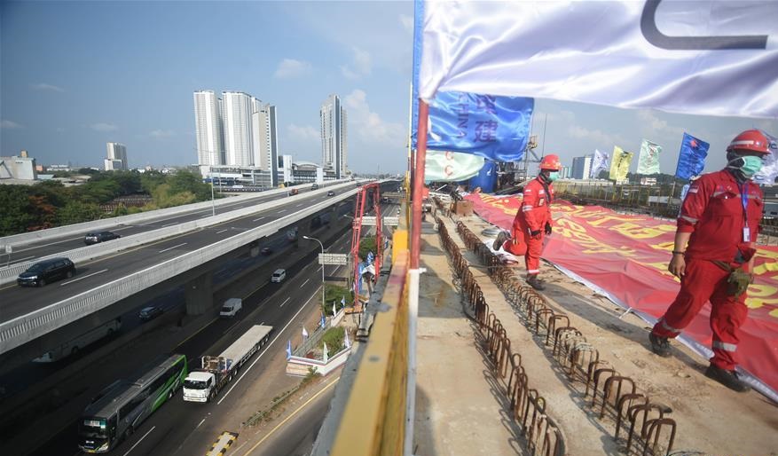 8月15日, 在印度尼西亚勿加泗,工人在印尼雅万高铁项目一处连续梁上行走。 印尼雅万高铁项目1号梁场雅加达至万隆方向架梁通道上的控制性工程-DK29处100米跨刚构连续梁于15日下午顺利合龙,标志着全线首个架梁通道的形成,为首个架梁段连续架梁创造了条件。 新华社发(祖卡南摄)