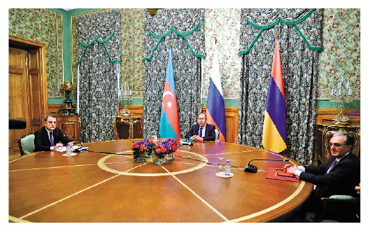 图①为俄罗斯、阿塞拜疆、亚美尼亚三国外长会晤讨论纳卡问题。 CFP供图