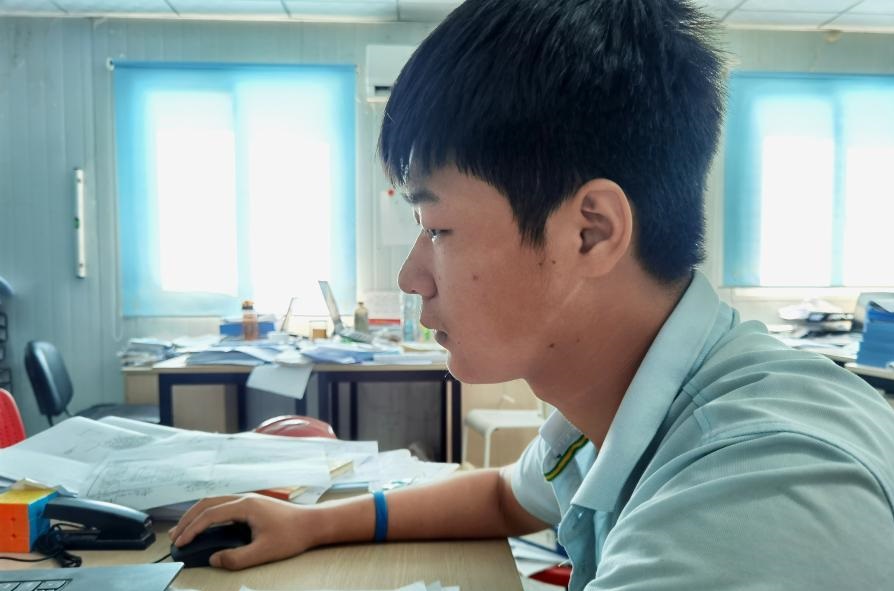 12月15日,在马尔代夫马累,一名脸上有口罩印的技术人员在维拉纳国际机场水飞航站楼项目办公室工作。新华社发(北京城建集团供图)