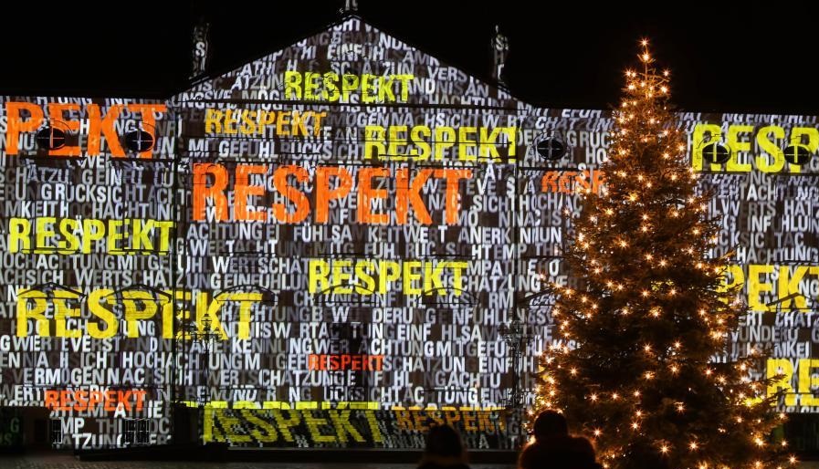 12月17日,在德国首都柏林,两名参观者观看被“尊重”字样点亮的德国总统府。