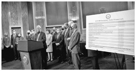 图为在美国两党僵持,9080亿美元新冠救济框架前途未卜之际,美国两党多名参议员12月出席与此相关的新闻发布会。 CFP供图