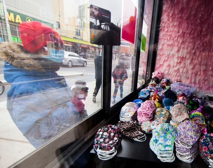 12月19日,在加拿大多伦多,一名戴口罩的男子在一家商店外查看销售的口罩。