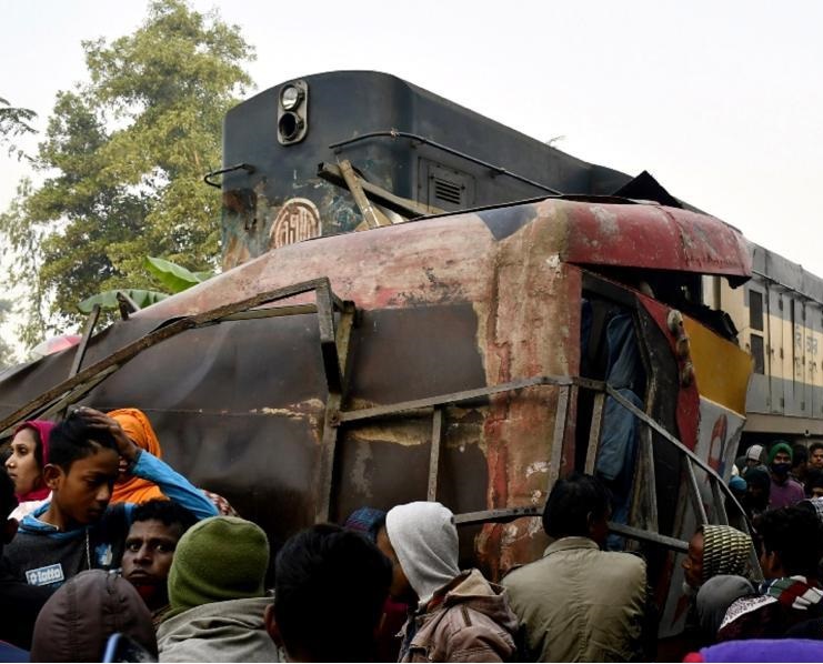 12月19日,人们聚集在孟加拉国西北部焦伊布尔哈德地区的火车与客车相撞事故现场。
