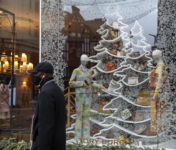 12月21日,一名戴口罩的男子从英国伦敦一家商铺橱窗里戴口罩的模特前走过。 圣诞节临近,英国部分地区新冠病毒传播速度加快,疫情令人担忧。英国政府正在调查这一状况是否与一种变异的新冠病毒有关,并将首都伦敦、英格兰东南部和东部部分地区的新冠疫情防控级别从第三级提升至新增加的第四级。 新华社记者 韩岩 摄