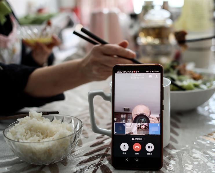 2月17日,一名摄影记者在北京的家中参加线上会议时拍摄参会使用的手机。新冠疫情暴发以来,居家办公、线上会议成为工作“新常态”。