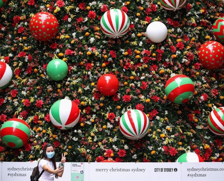 12月22日,市民佩戴口罩在澳大利亚悉尼的节日装饰前拍照。新华社记者 白雪飞 摄
