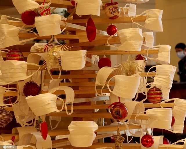 当地时间12月23日,印度孟买,一棵由口罩组成的圣诞树被摆放在当地酒店大堂。(图片来源:东方IC)