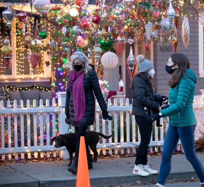 12月23日,人们在美国加利福尼亚州圣卡洛斯的社区观赏圣诞装饰。新华社发(李建国摄)