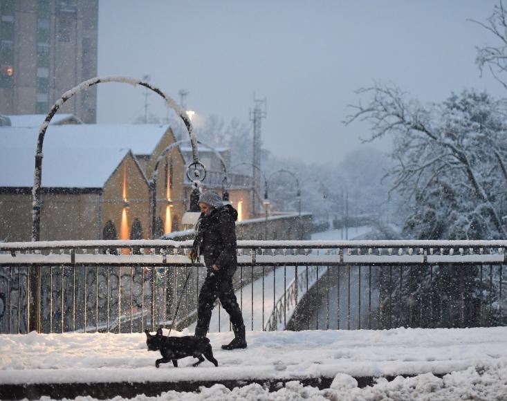 12月28日,在意大利北部城市米兰,一名女子在雪中遛狗。当日,米兰迎来降雪天气。新华社发(达尼埃莱·马斯科洛摄)