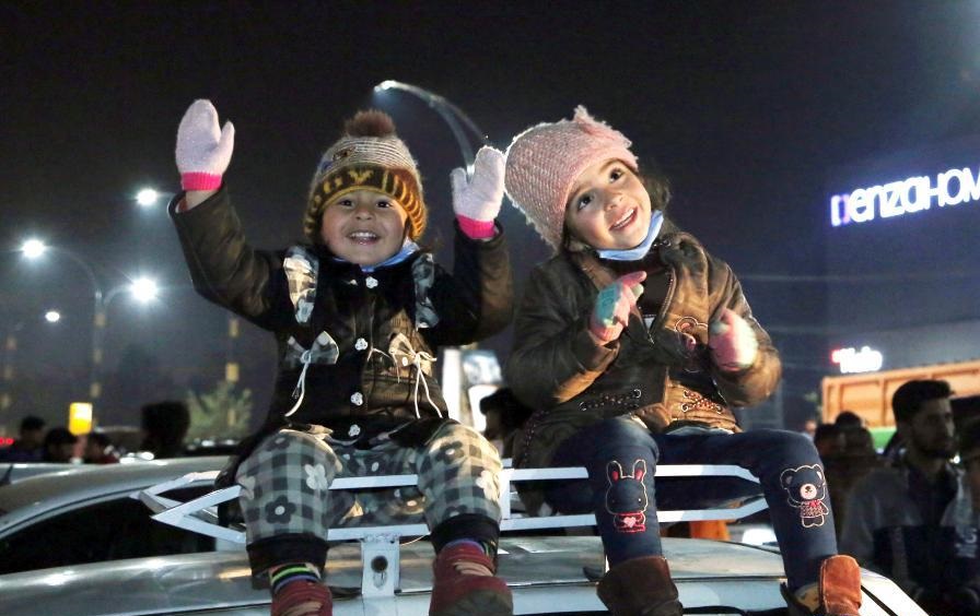 1月1日,两名儿童在巴基斯坦拉瓦尔品第的新年庆祝活动上照相。