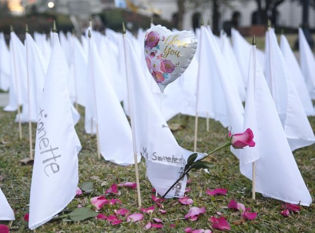 1月19日,在美国路易斯安那州新奥尔良市举行的新冠逝者悼念仪式上,气球和花被放置在白旗周围。新奥尔良市拉斐特广场上布置了近700面白色旗帜,用以纪念在疫情中丧生的新奥尔良人。
