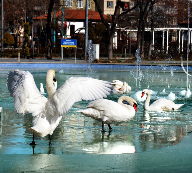 人民网讯 当地时间1月21日,土耳其科尼亚,Kultur公园里的天鹅在结了碎冰的池塘浮游。