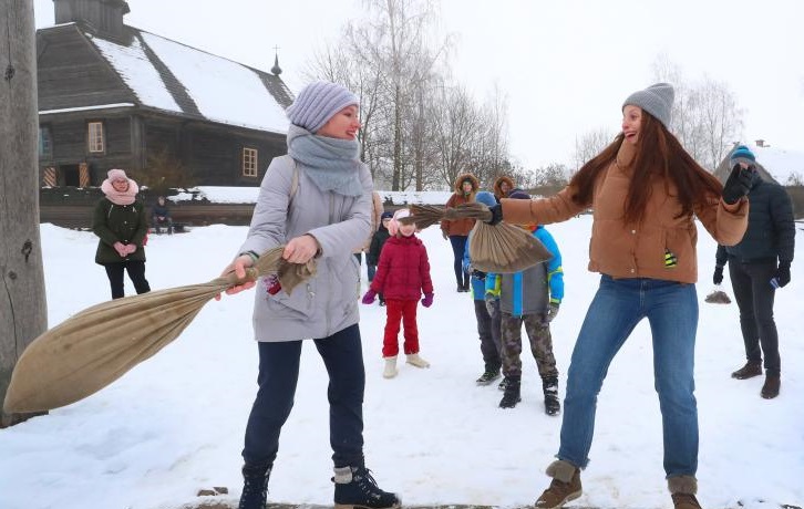 1月24日,年轻人在白俄罗斯首都明斯克郊区的民族建筑博物馆参与传统的冰雪游戏。新华社发(任科夫摄)